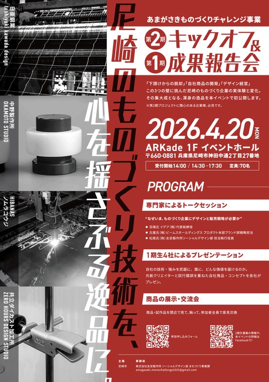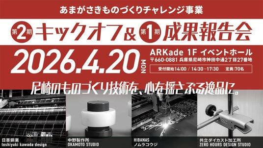 尼崎のものづくり企業×クリエイターの共創プロジェクト「あまがさきものづくりチャレンジ事業」の第2期キックオフと第1期成果報告会を合同開催いたします。