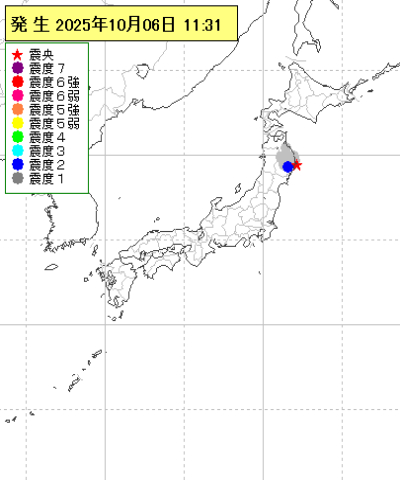 2025年10月06日11時31分ごろ | 岩手県沿岸北部 | 3.8 | 2 |
