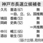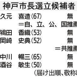 神戸新聞社は31日の神戸市長選投開票を前に、市民生活に直結する施策や市政の重要課題など11項目について、候補者5人にアンケートを実施した。3回に分けて、回答を原則としてそのまま掲載する。