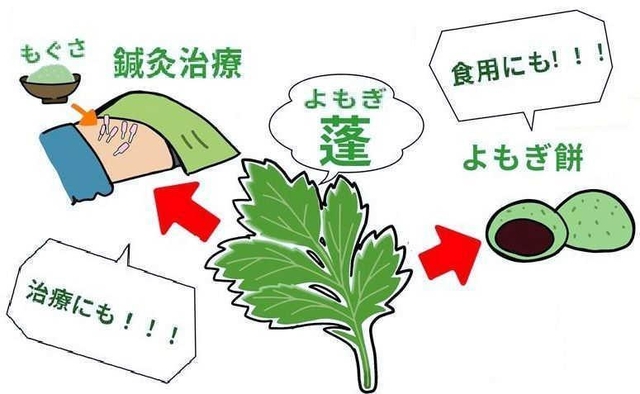 ヨモギは、若葉を刻んで餅に入れて草餅を作ることからモチグサと呼ばれたり、お灸に使われるためヤイトグサと呼ばれたりしていています。比較的どこにでも生え、昔から食用や薬草に用いられる有用な植物です。早春、新芽をゆでておひたしやあえ物にしたり、ヨモギ餅にして食べることがあります。よく生育した葉を採集し陰干ししたものは艾葉(がいよう)という生薬で、漢方では止血、沈痛、下痢止めなどの目的で使われています。