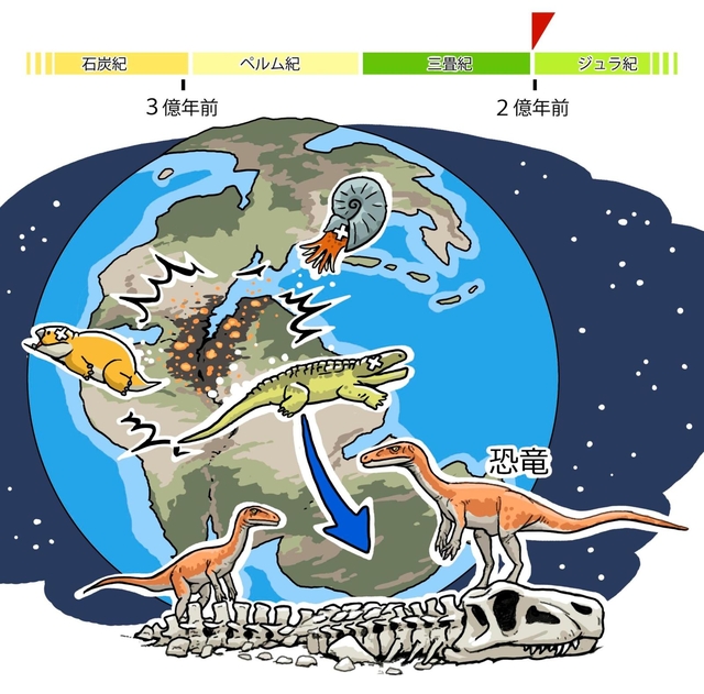 三畳紀(さんじょうき)の終わりに、地球はまた大きな危機(きき)に見まわれました。地球で5回起きた「ビッグファイブ」と呼(よ)ばれる大量絶滅(ぜつめつ)のうち、4回目に当たる事件(じけん)です。