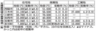北播磨地域の基準地価 商業地、上昇続く 住宅地は下落止まらず 2025/9/17 05:30 印刷 三木 北播 地価 神戸新聞NEXT 16日に発表された基準地価で、北播磨地域の商業地は昨年に続いて上昇し、プラス0・4%となった。一方で住宅地は加東市が上昇に転じ、小野市も堅調に上昇が続くが、北播磨全体ではマイナス0・3%と28年連続で下落した。 関連記事 【基準地価】投資拡大、活況続く 都心高騰も二極化進む 淡路島内の基準地価 平均額上昇、淡路市けん引 野島蟇浦、久留麻など顕著 神戸市内の基準地価 全区で上昇傾向、再開発で伸び続く 但馬地域の基準地価 商業地2年連続上昇、城崎温泉街は県内3位のプラス幅 明石市内の基準地価、全地点で3年連続上昇 魚住町清水7.4%上昇、県内3位 関連記事 【基準地価】投資拡大、活況続く 都心高騰も二極化進む 淡路島内の基準地価 平均額上昇、淡路市けん引 野島蟇浦、久留麻など顕著 神戸市内の基準地価 全区で上昇傾向、再開発で伸び続く 但馬地域の基準地価 商業地2年連続上昇、城崎温泉街は県内3位のプラス幅 明石市内の基準地価、全地点で3年連続上昇 魚住町清水7.4%上昇、県内3位 きょうの注目記事 女性初首相に高市氏選出 連立政権、物価高対策の指示検討 10/21 14:32 明石・材木町の下水管腐食、2度の点検でなぜ見逃された? 10/21 05:30 明石 地方行政 4県で窃盗繰り返した疑い 63歳男「泥棒でしか生きていけない」 10/21 14:00 事件・事故 小栗忠順の妻道子を演じる俳優は? 姫路・林田町の住民らドキドキ 10/21 05:30 姫路 新温泉町長選告示 現職と新人3人が立候補届け出 10/21 09:00 社会 選挙 但馬 佐用町長選告示 3新人が立候補届け出、12年ぶり選挙戦へ 10/21 09:05 社会 選挙 西播 書写山ロープウェイ きょう21日、強風で終日運休に 10/21 09:11 社会 姫路 【ライブ中継】囲碁天元戦、札幌で第2局始まる 10/21 11:11 文化 囲碁将棋 天元戦 「赤ばやし」で猿田彦が勇躍 高砂・生石神社の秋祭り 10/21 05:30 東播 秋祭り 華麗、鉾山巡行 勇壮、武者行列 たんばの秋祭り 10/21 05:30 丹波 秋祭り 神戸市長選 久元氏がリード、五島氏続く 本紙情勢調査 10/21 05:30 社会 神戸市長選 神戸 選挙 自維連立にきしむ兵庫 維新は歓迎、自民には拒否感 10/21 05:30 社会 きょうの注目記事 女性初首相に高市氏選出 連立政権、物価高対策の指示検討 10/21 14:32 明石・材木町の下水管腐食、2度の点検でなぜ見逃された? 10/21 05:30 明石 地方行政 4県で窃盗繰り返した疑い 63歳男「泥棒でしか生きていけない」 10/21 14:00 事件・事故 小栗忠順の妻道子を演じる俳優は? 姫路・林田町の住民らドキドキ 10/21 05:30 姫路 新温泉町長選告示 現職と新人3人が立候補届け出 10/21 09:00 社会 選挙 但馬 佐用町長選告示 3新人が立候補届け出、12年ぶり選挙戦へ 10/21 09:05 社会 選挙 西播 書写山ロープウェイ きょう21日、強風で終日運休に 10/21 09:11 社会 姫路 【ライブ中継】囲碁天元戦、札幌で第2局始まる 10/21 11:11 文化 囲碁将棋 天元戦 「赤ばやし」で猿田彦が勇躍 高砂・生石神社の秋祭り 10/21 05:30 東播 秋祭り 華麗、鉾山巡行 勇壮、武者行列 たんばの秋祭り 10/21 05:30 丹波 秋祭り 神戸市長選 久元氏がリード、五島氏続く 本紙情勢調査 10/21 05:30 社会 神戸市長選 神戸 選挙 自維連立にきしむ兵庫 維新は歓迎、自民には拒否感 10/21 05:30 社会 三木新着ニュース 三木新着ニュース