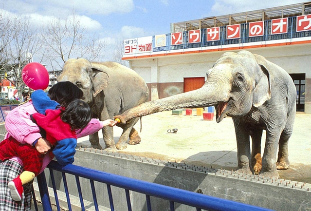 ゾウとふれ合う来場客(にしのみやデジタルアーカイブ提供)