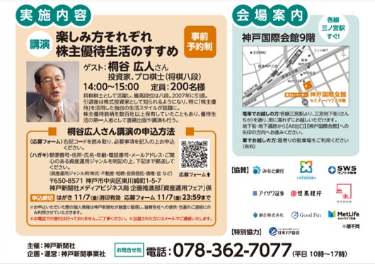 当日は、テレビでお馴染みの桐谷広人氏(プロ棋士・投資家)を講師に迎え、「楽しみ方それぞれ 株主優待生活のすすめ」(14時~15時)と題して講演いただきます。