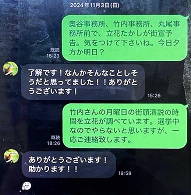 〈竹内事務所前で立花が街宣予告〉〈気をつけてくださいね〉。竹内は丸尾のメッセージを妻に転送し、〈事務所には行かないように〉とだけ書き添えた。