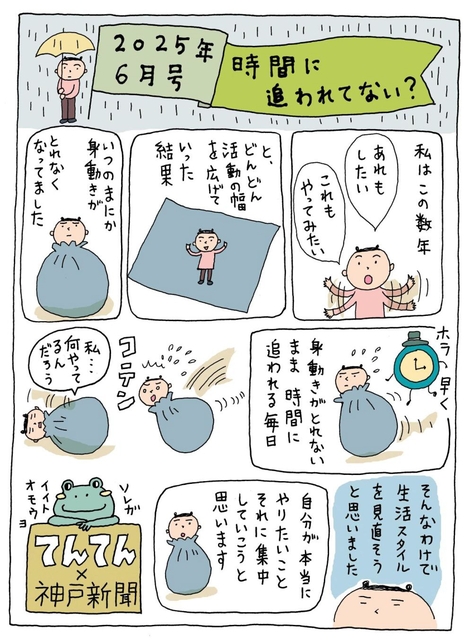 細川貂々さんのエッセー漫画 2025年6月号「時間に追われてない?」 2025/6/23 10:00 印刷 生きるのヘタ会? 細川貂々さんのエッセー漫画 きょうの注目記事 神戸市長選、問われる人口減対策 「150万都市」25年後に推計人口2割減 10/23 05:30 社会 神戸市長選 選挙 小中学校再編統合「速やかに進める」 廃校舎解体せず費用圧縮 三田市財政ロードマップ案 10/23 05:30 三田 地方行政 子育て 教育 廃食用油を航空機燃料に 加古川市がノウハウ持つ企業と連携協定 市内に回収ボックス設置へ 10/23 05:30 東播 地方行政 三木の農に触れ課題や魅力学ぶ 甲南大生がフィールドワーク 山田錦の生産者から聞き取り 10/23 05:30 三木 斎藤知事の給与減額案、再び継続審議決定 知事答弁に議長が異例の苦言も 兵庫県議会 10/22 20:45 社会 再負託 斎藤県政 たつの市長選 立候補者2人の主張や横顔紹介 趣味や特技、素顔にも迫る 26日投開票 10/23 05:30 西播 選挙 佐用町長選 12年ぶりの選挙戦、候補者3人の主張や横顔を紹介 26日投開票 10/23 05:30 西播 選挙 新温泉町長選 立候補者4人の主張や横顔を紹介 26日投開票 10/23 05:30 但馬 選挙 ヴィッセル神戸、江原に敗戦でACLE初黒星 3-4で競り負け 1次リーグ 10/22 22:10 スポーツ ヴィッセル <ロッカールーム>小所帯、意地のタッチダウン 仁川高アメフト部・花木聡ヘッドコーチ 10/23 05:30 スポーツ 高校スポーツ 仁川学院高校 「前泊」は視察並みの詳報提出を義務化 政活費不適切支出で手引き改訂 県議会 10/22 19:30 社会 自民、N党議員と会派結成「経緯の説明を」 自民兵庫県議団、参院会長に意見書提出へ 10/22 20:03 社会 きょうの注目記事 神戸市長選、問われる人口減対策 「150万都市」25年後に推計人口2割減 10/23 05:30 社会 神戸市長選 選挙 小中学校再編統合「速やかに進める」 廃校舎解体せず費用圧縮 三田市財政ロードマップ案 10/23 05:30 三田 地方行政 子育て 教育 廃食用油を航空機燃料に 加古川市がノウハウ持つ企業と連携協定 市内に回収ボックス設置へ 10/23 05:30 東播 地方行政 三木の農に触れ課題や魅力学ぶ 甲南大生がフィールドワーク 山田錦の生産者から聞き取り 10/23 05:30 三木 斎藤知事の給与減額案、再び継続審議決定 知事答弁に議長が異例の苦言も 兵庫県議会 10/22 20:45 社会 再負託 斎藤県政 たつの市長選 立候補者2人の主張や横顔紹介 趣味や特技、素顔にも迫る 26日投開票 10/23 05:30 西播 選挙 佐用町長選 12年ぶりの選挙戦、候補者3人の主張や横顔を紹介 26日投開票 10/23 05:30 西播 選挙 新温泉町長選 立候補者4人の主張や横顔を紹介 26日投開票 10/23 05:30 但馬 選挙 ヴィッセル神戸、江原に敗戦でACLE初黒星 3-4で競り負け 1次リーグ 10/22 22:10 スポーツ ヴィッセル <ロッカールーム>小所帯、意地のタッチダウン 仁川高アメフト部・花木聡ヘッドコーチ 10/23 05:30 スポーツ 高校スポーツ 仁川学院高校 「前泊」は視察並みの詳報提出を義務化 政活費不適切支出で手引き改訂 県議会 10/22 19:30 社会 自民、N党議員と会派結成「経緯の説明を」 自民兵庫県議団、参院会長に意見書提出へ 10/22 20:03 社会 生きるのヘタ会?新着ニュース 生きるのヘタ会?新着ニュース