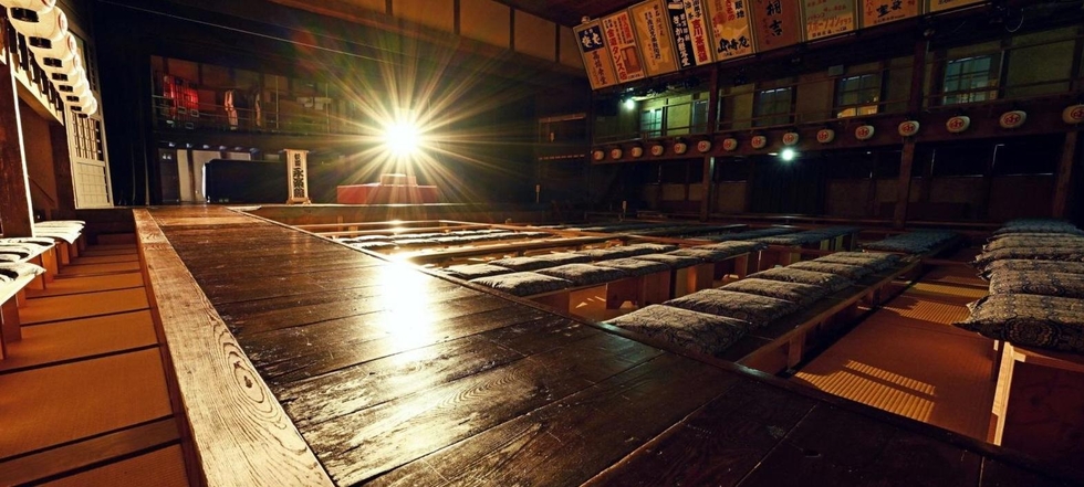 柿渋が塗り重ねられた焦げ茶色の板をそっと踏みしめる。120年以上の歴史を持つ「花道」。滑らかな木の表面にわずかに刻まれた凹凸が、繰り広げられてきた古典芸能の余韻を宿している。