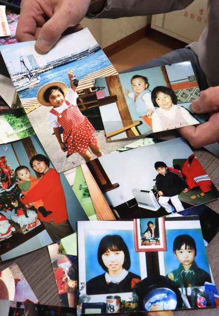 家族の写真を手に話す羽中健二さん。帽子をかぶり愛らしい表情を見せる愛梨ちゃんや、幼い敬登さんを抱き、笑顔を見せる妻の幸恵さんが写る=神戸市内
