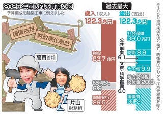 高市政権が決定した2026年度当初予算案は「責任ある積極財政」の看板通り過去最大に膨らんだ。財政の持続性に疑念を強める市場は長期金利上昇と円安という形で警鐘を鳴らすが、安定財源を確保する「責任」部分は見えてこない。成長投資が効果を上げず不発に終われば、景気も財政も悪化する逆回転リスクをはらんでいる。