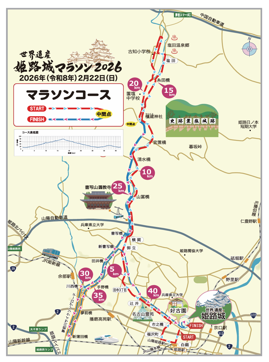 世界遺産姫路城マラソン2026のコースをご紹介します。 世界遺産姫路城を始め、姫路の名所旧跡や自然を満喫できるコースです。 (コースは一部変更になる場合があります。)