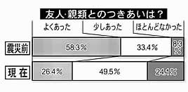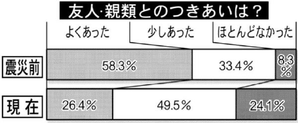 友人、親類とのつきあいは震災前と比べ、「よくある」が31・9ポイントも減少。逆に「少しある」が16・1ポイント、「ほとんどない」が15・8ポイントとそれぞれ増えた。