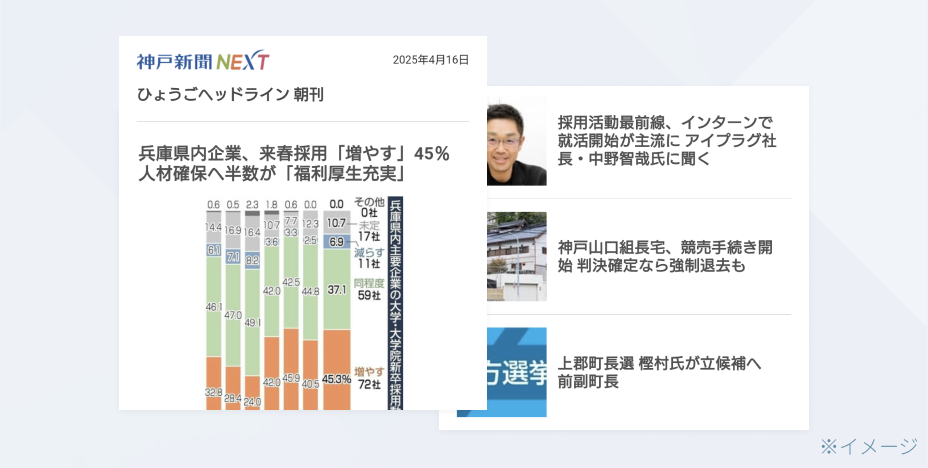 - 神戸新聞NEXTのすべての機能を、制限なくお使いいただけます。また、経済・行政ニュースの中から閲覧行動に応じてその人にあったニュースをおすすめする「マイビジネスインサイト」も法人会員限定でご提供しています。