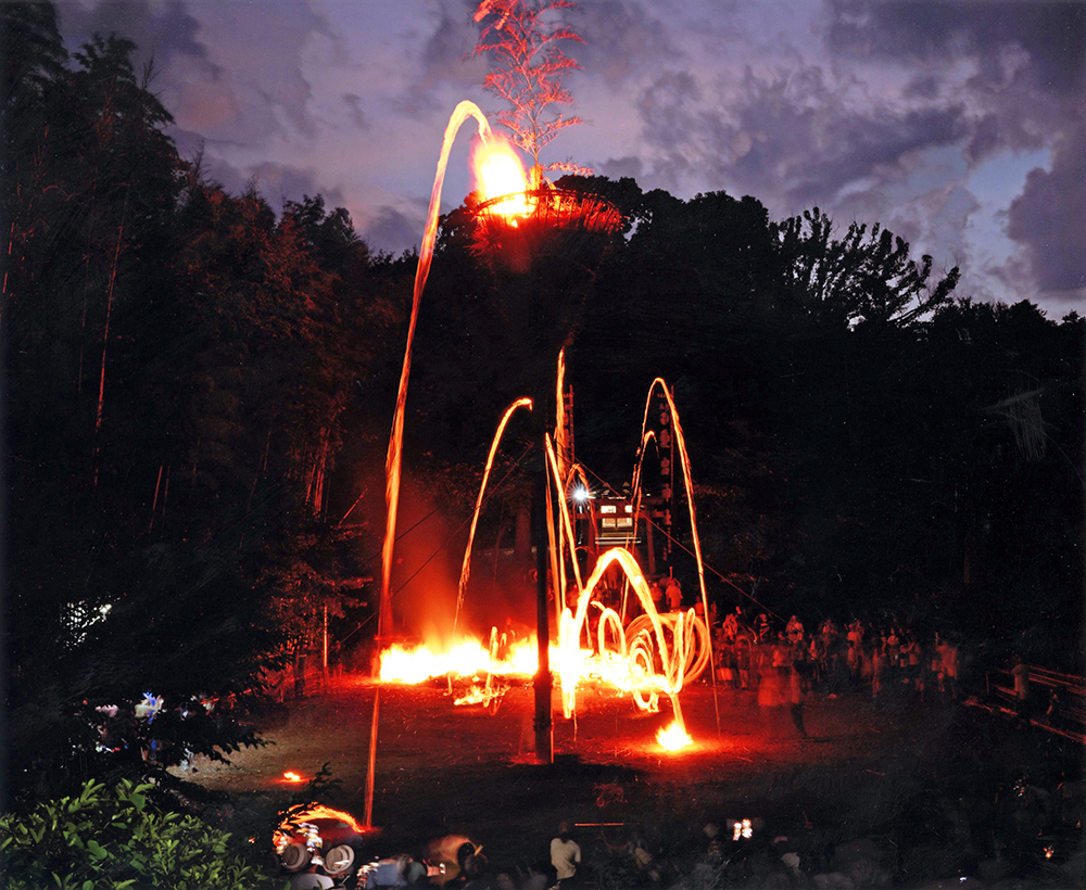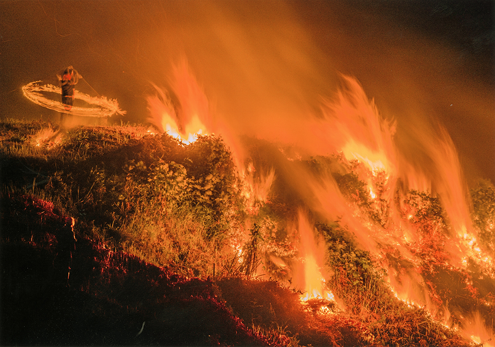 先祖の霊を送り出す伝統行事「火踊り」。炎が魂を宿しているようで目を引きました。(ニコンD850 28~300ミリ 絞りf25 2秒)