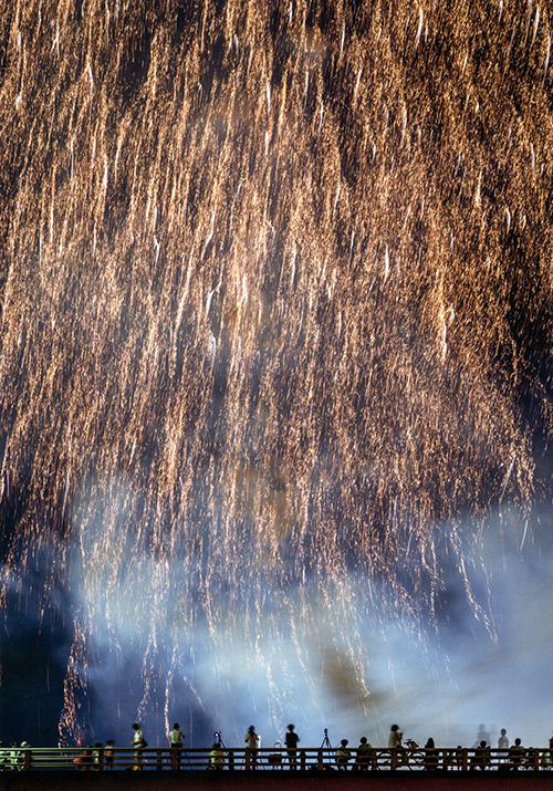 雨のように落ちる花火。見物する人たちも写し込み、迫力ある1枚に仕上げました。(ソニーα7RⅣ 100~400ミリ 絞りf11 8秒)