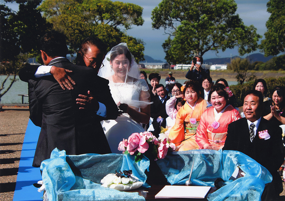 愛するわが子を託す父の気持ちが、少しうつむいた表情から伝わってきます。新郎の背中にも決意を感じました。池を背景にした結婚式も新鮮です。(キヤノンEOSR7 18~400ミリ 絞りf5・6 3200分の1秒)