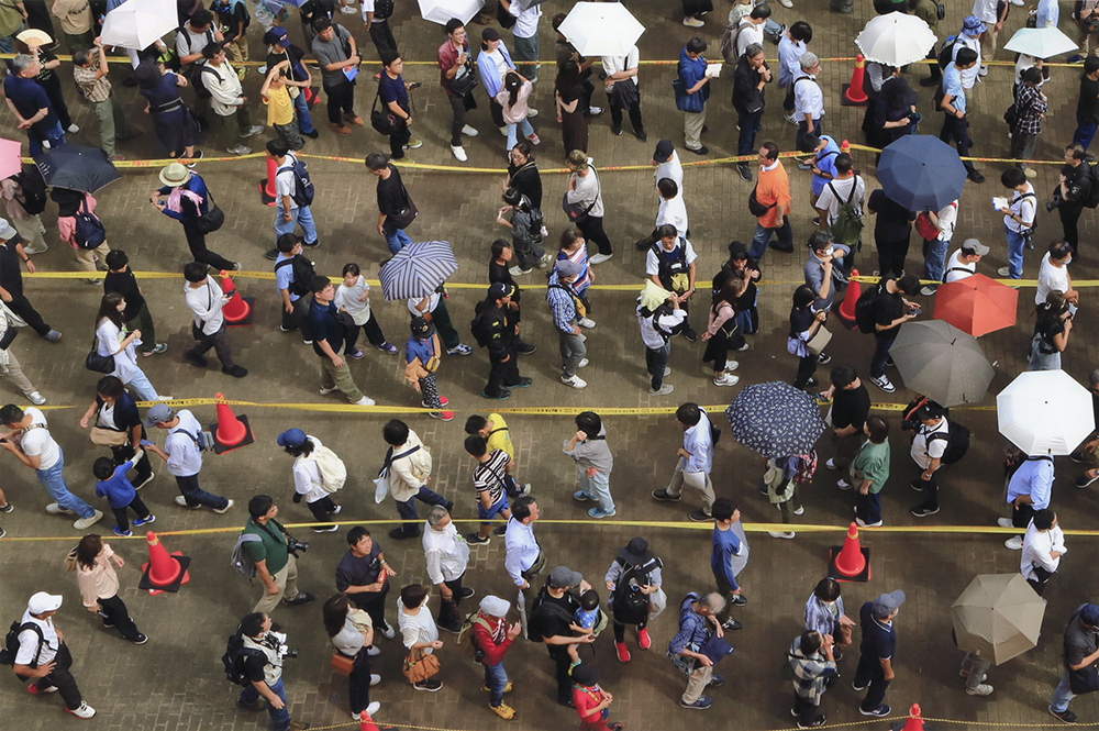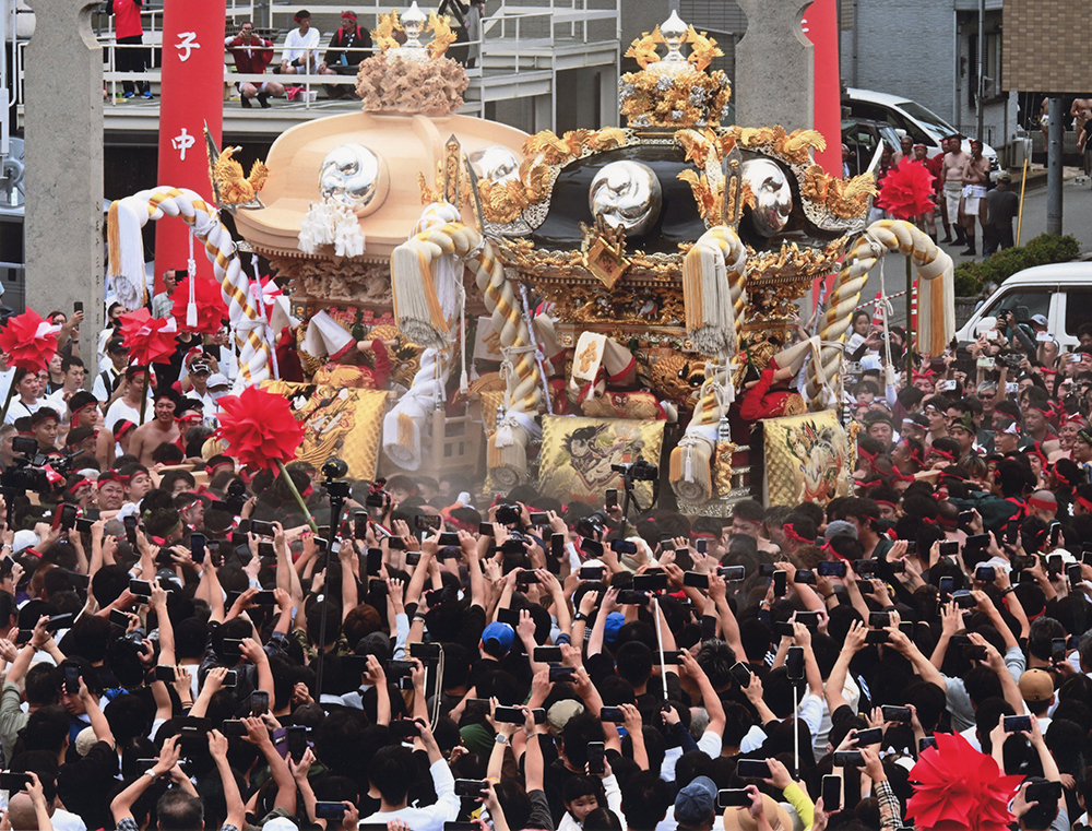 撮影者いわく「この光景を見た時、鳥肌が立った」。小さな画面の多さに驚かされます。祭りどころの熱量を実感します。(ニコンZ9 140ミリ 絞りf36 100分の1秒)