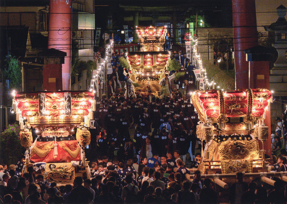 全4地区の布団太鼓が闇夜に浮かび上がるまでじっと待ったそう。氏子もびっしりで、奥行きがある構図にまとまりました。(ニコンZ7 115ミリ 絞りf3.5 800分の1秒)