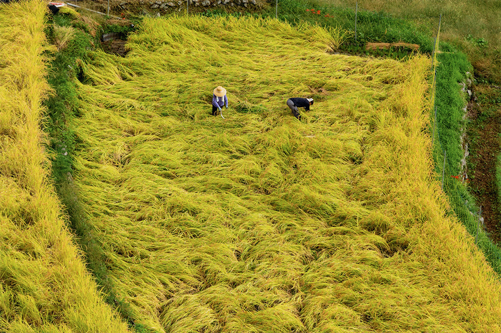 コメの価格高騰が続く中、倒れてしまった稲。人力で収穫する姿はこれまで以上に貴く見え、頭が下がります。(キヤノンEOSR6 24~105ミリ 絞りf8 400分の1秒)