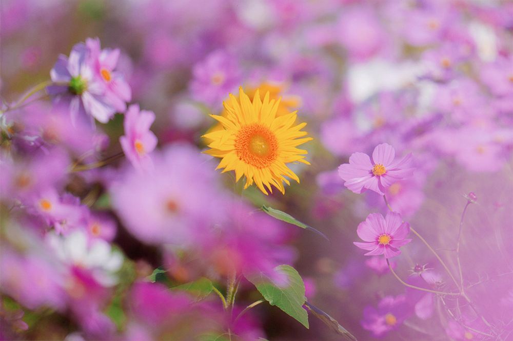 ピンク色に染まった畑の中に一輪のヒマワリ。意外性に加えて、望遠レンズのぼけ味が生きました。(ソニーα7RⅢ 150~500ミリ 絞りf6・7 800分の1秒)