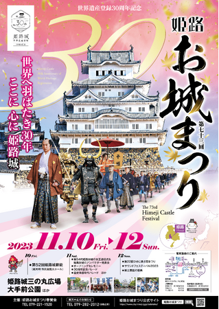 姫路市では11月10日(金)から12日(日)の期間、姫路城三の丸広場を含む姫路市街地で「第73回姫路お城まつり」を開催します。世界文化遺産国宝姫路城の魅力発信や姫路市民の愛城意識の啓発、そして世界文化遺産を擁する各地との連携を図るなどをコンセプトに掲げ、姫路城の世界遺産登録30周年記念事業の秋のメインイベントとして姫路の街を盛り上げます。