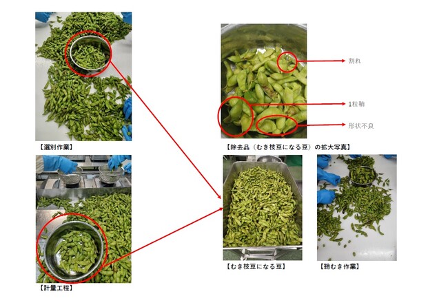 ● 「黒枝豆のビーフン ペペロンチーノ風」に使用している黒枝豆は、製造過程の選別や計量行程の中で、割れたり形状が悪かったりして、冷凍商品の「丹波黒枝豆」にはできない、規格外品となったものを使用しています。見た目や味としては何も変わらないので、フードロスを減らしたいと考え開発に至りました。