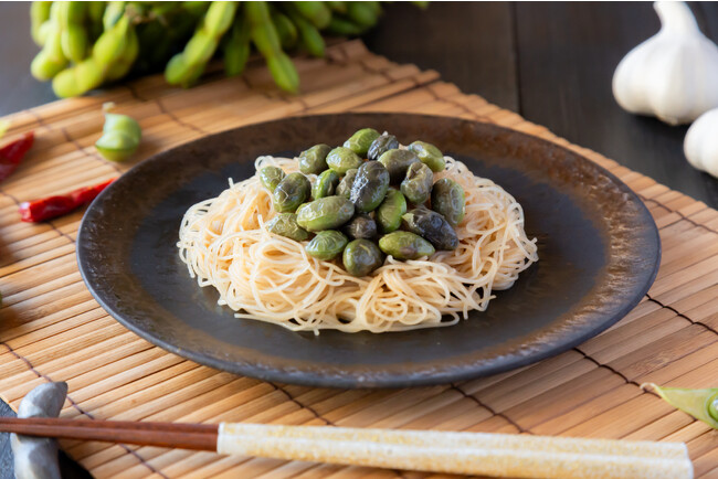 丹波黒枝豆の甘みとにんにくの風味がマッチした、ペペロンチーノ風仕立ての焼ビーフンです。