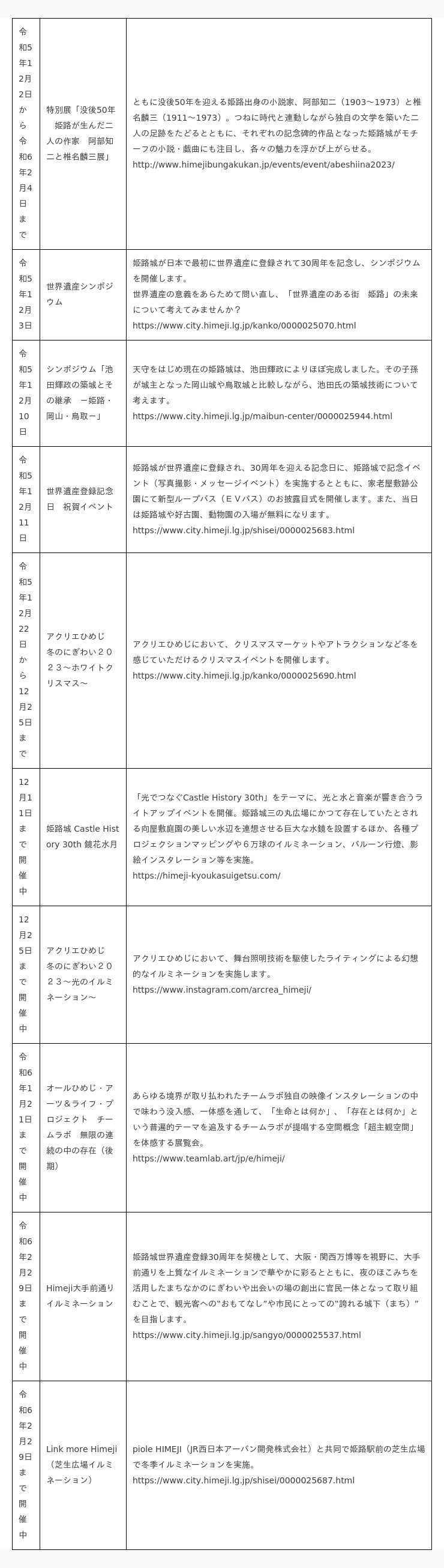 上記以外にも様々な記念事業を実施しますので、姫路城世界遺産登録30周年記念事業特設ホームページにてご確認ください。ぜひ、皆様のご来城をお待ちしております。