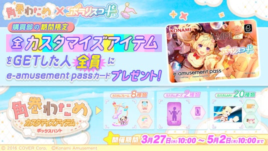 「e-amusementサイト」内の「購買部」にて、『角巻わため』の全カスタマイズアイテムを購入した方全員に「『角巻わため』×『ポラリスコード』e-amusement passカード」をプレゼントします。