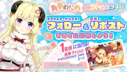 株式会社コナミアミューズメントは、全国のアミューズメント施設にて新作音楽ゲーム『ポラリスコード』の3月27日(水)からの稼働開始を記念して、カバー株式会社が運営する女性VTuberグループ「ホロライブ」所属の人気タレント『角巻わため』とのコラボレーションイベントを開始することをお知らせします。