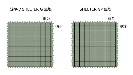 SHELTER GPはナイロン40D 260T H/B / Silicone / PU Coating耐水圧2,000mmで、既存のSHELTER Gの生地よりも縦糸を厚くして張力を高め、耐久性を強化したスキンにアップグレードしました。