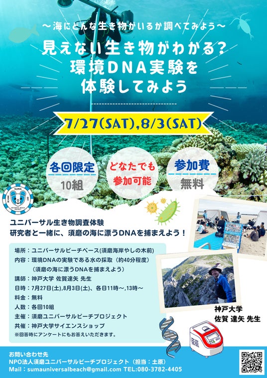 NPO法人須磨ユニバーサルビーチプロジェクト(須磨UBP)は、神戸大学佐賀研究室と協力し、須磨の海に漂うDNAを捕まえる環境DNA実験を実施します。この取り組みは、障がいの有無に関係なく自然実験やアウトドアに参加できる環境を整えることで、科学リテラシーの向上を図ることを目的としています。実験は7月27日(土)と8月3日(土)、後日(日時未定)に結果と考察のワークショップを開催します。