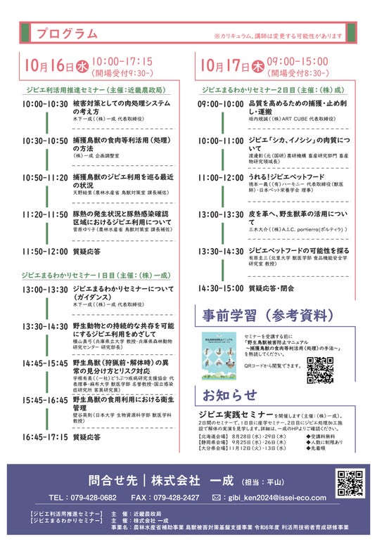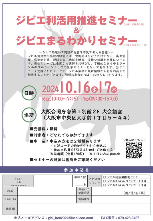 ジビエ利活用推進セミナー(主催:近畿農政局)とジビエまるわかりセミナー(主催:株式会社 一成)を2日間にわたって開催します。