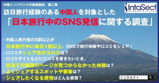 中国・台湾などの海外プロモーション・インバウンド支援を行うインタセクト・コミュニケーションズ株式会社(本社:東京都千代田区、代表取締役社長:譚 玉峰、以下 インタセクト)は、中国からのインバウンド観光が回復基調にある中、その最新動向を探るべく、訪日旅行経験のある中国人を対象に「日本旅行中のSNS発信に関する調査」を実施しました。本ニュースリリースでは、その調査結果を発表いたします。