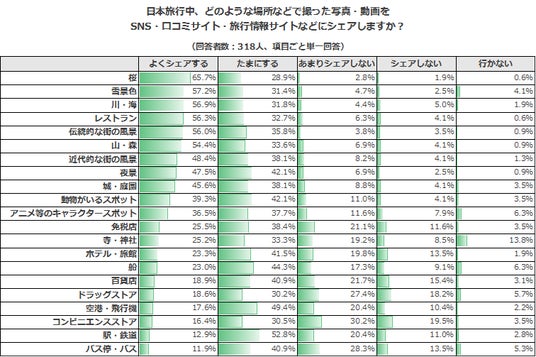 SNS等にシェアする撮影スポットに関しては、やはり日本を象徴する景色とも言える「桜」が人気で、「よくシェアする」と回答した人は3人に2人(65.7%:209人)にのぼり、「たまにシェアする」(28.9%:92人)とあわせると、全体の94.6%:301人になりました。次に「よくシェアする」が多かったのが「雪景色」、「川・海」で、日本の自然にまつわるスポットが上位に並びました。