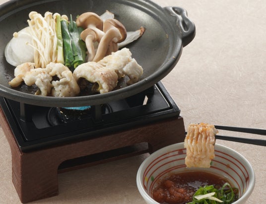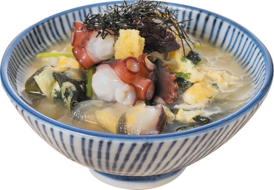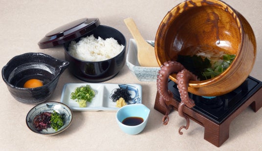 蛸坪に見たてたオリジナルの器の外に、蛸がはみ出した形で提供される衝撃的(?)な見た目のメニュー。 初夏~夏が旬の淡路島の蛸は噛み応えがあり、何もつけなくても充分なおいしさです。吸盤のコリコリした食感も楽しめ、お茶漬けにしてお召し上がりいただくのに最高です。