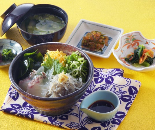 ぷりぷりの食感がクセになる岩屋漁港で水揚げされた鮮度抜群の生しらすと鯛の松皮造りをトッピングした淡路米の丼ぶりです。