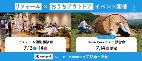 - 内容:リフォーム個別相談会(13~14日のみ)、スノーピークテント設営講習・展示会(14日のみ)、スノーピーク商品の物販(13~15日)