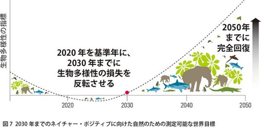 世界では失われた生態系を回復し、“ネイチャーポジティブ”を推進する動きが広がっています。具体的には、2020年をベースラインとして、2030 年までに生物多様性の損失を反転させネットポジティブになるよう、生態系回復により一層力を入れていくことが求められています。そして、2050年には、将来世代を含めたすべての人々の生活と生物の生息環境を支えられる地球の健全な自然生態系の回復と維持を目指すことが近年の潮流となっています。