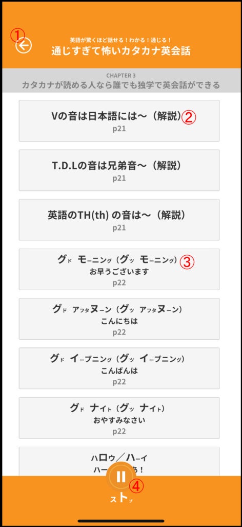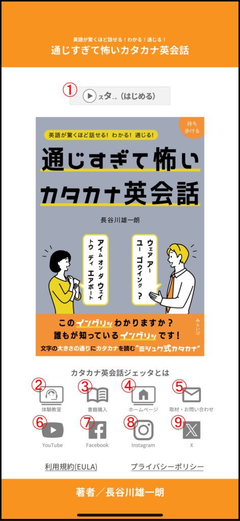 書籍『通じすぎて怖いカタカナ英会話』のCHAPTER1~20に掲載している単語やフレーズのお手本の発音をヒアリングできる補助教材アプリです。書籍で視覚的に発音を理解し、音声アプリを併用することで感覚的に発音が身につき、実際に発音してみることで身体的に体得することができます。