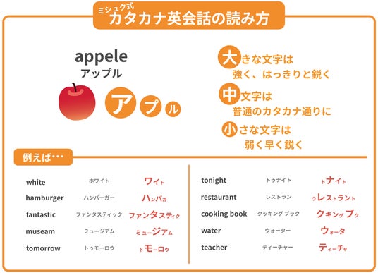 【英単語の読み方が、大中小、3つの大きさのカタカナで表示されている】