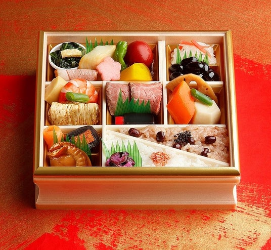 赤飯と白御飯の紅白御飯に紅白なます・黒豆・梅の甘露煮などの縁起物に加え、国産牛ローストビーフやスモークサーモンもお詰めしました。ご長寿のお祝いや新生活への門出・お顔合わせなど特別な御席を華やかに彩ります。