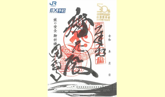 特別御朱印の台紙には山陽新幹線全線開業50周年のロゴスタンプと新幹線のイラストが入っており、本プランだけでいただける特別なデザインとなります。安全なご旅行となるよう、この機会にぜひお参りください。