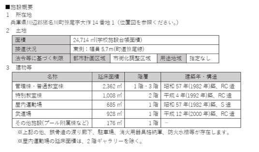 兵庫県猪名川町では、令和4年3月31日に閉校となった旧六瀬中学校跡地の有効活用について検討されており、地域の活性化や地域雇用の創出、地域貢献に寄与するなど、活用を通じて地域に新たな価値を創り出し、地域の持続的な発展に繋がる事業を提案実行する事業者を募集されていました。