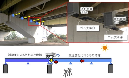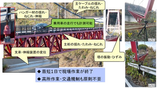 ・計測方法について、接触式変位計等では構造物に計測用機材を取り付けて計測する必要があったところ、本システムではデジタルカメラで遠方から撮影した動画で解析をおこなうため、構造物に対して非接触での計測が可能です。