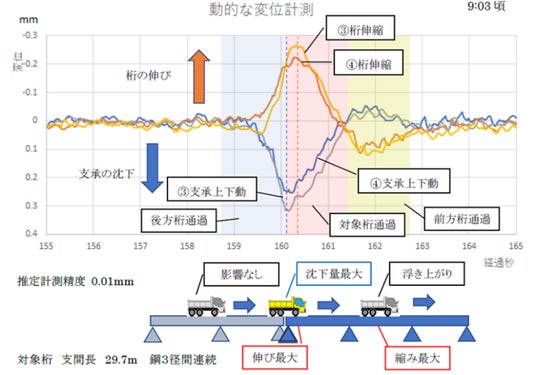 接近が難しい高所の部位に対し、計測器や測定ターゲットを設置することなく、遠方(桁下部~50m離れ)から望遠レンズを搭載したデジタルカメラで動画撮影を行います。動画像解析ソフトにより鉛直・水平変位を算出することで、橋桁や床版のたわみ・振動、支承部の挙動を把握し、橋梁の健全性を確かめることができます。