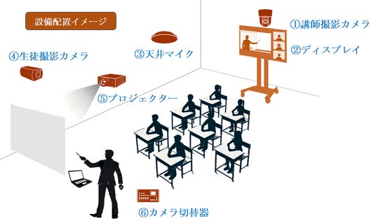 〈図1〉では、教室に先生と生徒様がいる発信校をイメージして設備を配置しました。先生と生徒の声をオンライン生徒に届ける天井マイクや(図左の中央)、オンライン生徒を映すディスプレイ(図左の右側)などが配置されています。
