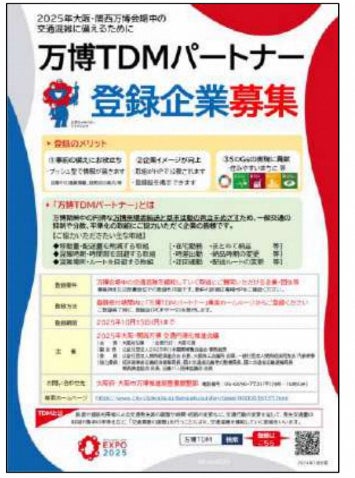 当社も登録している『万博TDMパートナー』は、2025年大阪・関西万博会期中の交通混雑に備えるため、企業・団体が大阪府域において一般交通の抑制や分散、平準化の取り組み(※TDM)への協力姿勢を示す登録制度です。会期中の交通混雑情報を受け取れるだけでなく、SDGs実現への貢献や企業イメージ向上にもつながるメリットがあります。登録期限は2025年10月13日(日)まで、詳細は専用HPよりご確認ください。