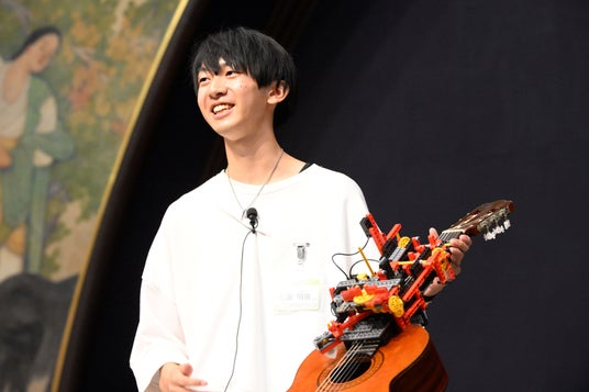修了生の花園明良さんが披露したギターを演奏するロボット