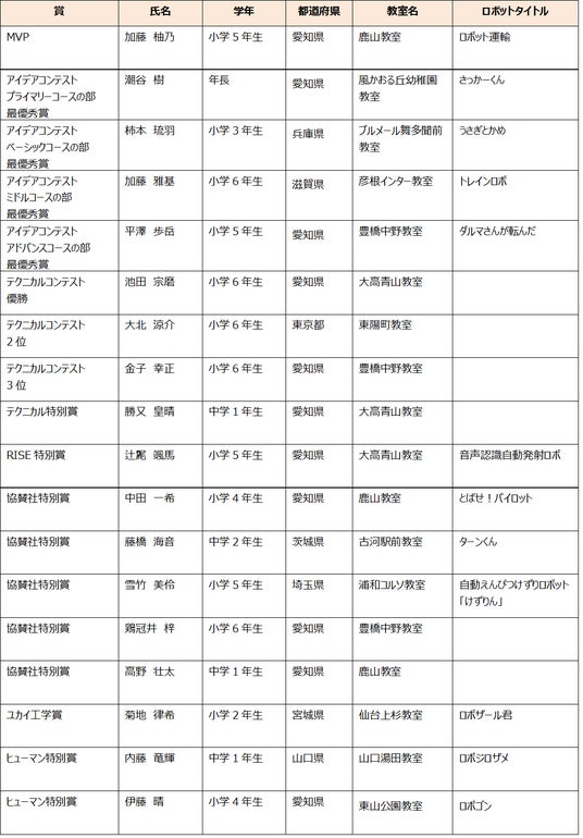●ロボット教室の生徒、全国27,000名以上の中から予選審査を勝ち抜いた27名から受賞者が決定