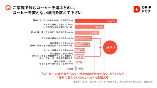 上記の設問で「試したことはあるが、基本的にコーヒーを変えることはない」と回答した人に対し、コーヒーを変えない理由について調査したところ、「好みに合わないかもしれないと不安だから」(42.0%)が最も高い結果に。また「自分の味の好みが分からないから」「味の想像がつかないから」「コーヒーの味が分からない」といった味わいに対する不安や、味わいが分からない、といった回答を合計すると「好みに合わないかもしれない」を超え(51.4%)、非常に不安があるということが明らかになりました。
